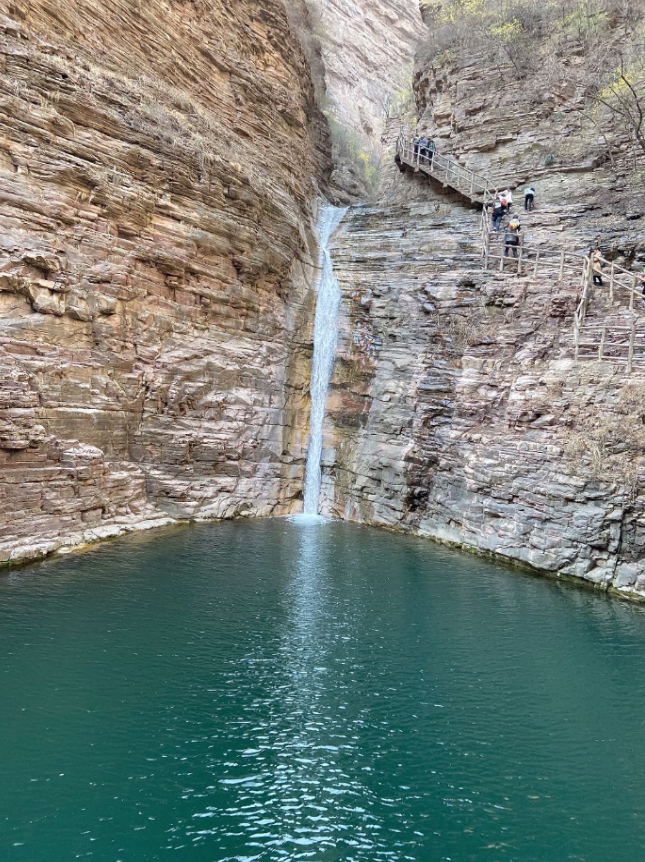 經(jīng)過(guò)一晚上的休息,第二天早上大家精神抖擻的趕到桃花谷景區(qū)。它是以山、谷、潭、洞為主的自然景區(qū)。因其“三九嚴(yán)寒桃花開,三伏酷暑水結(jié)冰和346米高亞洲高瀑布”而聞名于世。在往景區(qū)深處,隨著指引來(lái)到太行天路景區(qū)。太行天路景區(qū)位于太行山之巔,北起桃花谷景區(qū),南至仙霞谷景區(qū),全長(zhǎng)約30km,既是景區(qū)環(huán)線游覽道路的重要組成部分,更是俯瞰太行山壯美風(fēng)光的好位置。乘坐觀光車游走于太行天路,深邃的峽谷、直立的巖壁,帶給我們強(qiáng)烈的視覺(jué)震懾。